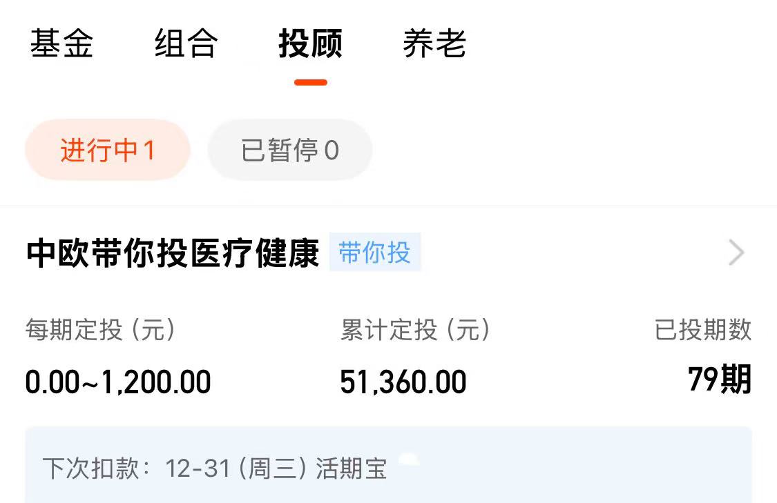 2、我坚持双周定投中欧财富投顾的“中欧带你投医疗健康”投顾计划超过3年时间(79期),累计投入资金超过51360元,我也将继续坚持定投下去。