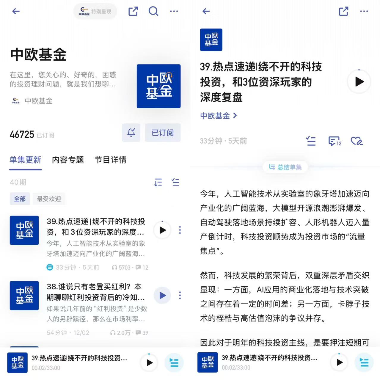 综合而言,目前我在中欧基金持有的8只基金和投顾计划上累计投资超过18万元,既是我投资最多的基金公司,并且都带了超越同时产品的超额回报。同时,我也订阅了“小宇宙”中的“中欧基金”,也积极收听了“第39期”节目——基金经理代云锋和杜厚良讲解的“绕不开的科技投资,和3位资深玩家深度复盘”,伴随中欧基金共同成长!
