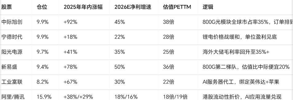 3. 板块纯度:前十大重仓清一色科技成长,算力+光模块+锂电+互联网平台,合计占比78.5%,是一只“纯科技矛”。