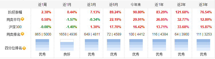 从过往业绩来看,这只基金表现可圈可点。近1周收益2.38%;近1月收益0.44%;近3月收益7.13%;近6月收益89.24%;近1年收益83.29%;近2年收益121.68%;近3年收益76.54%;今年来收益90.8%。从2022年11月22日成立以来,截至目前收益达到77.39%。这样的业绩表现说明基金经理有较强的投资管理能力,能把握市场机会,为投资者带来较好回报。