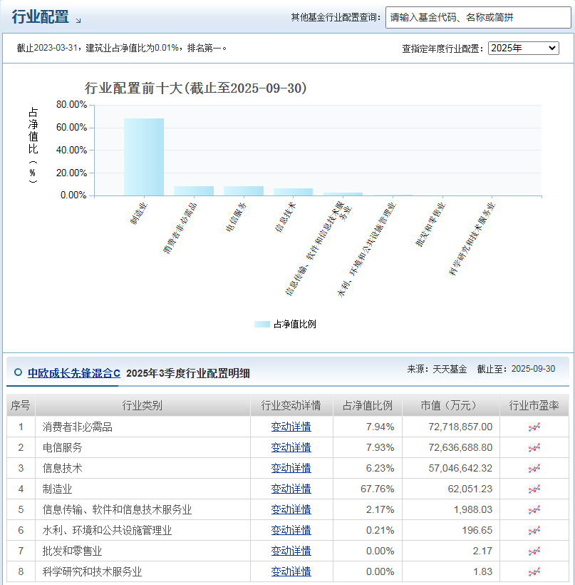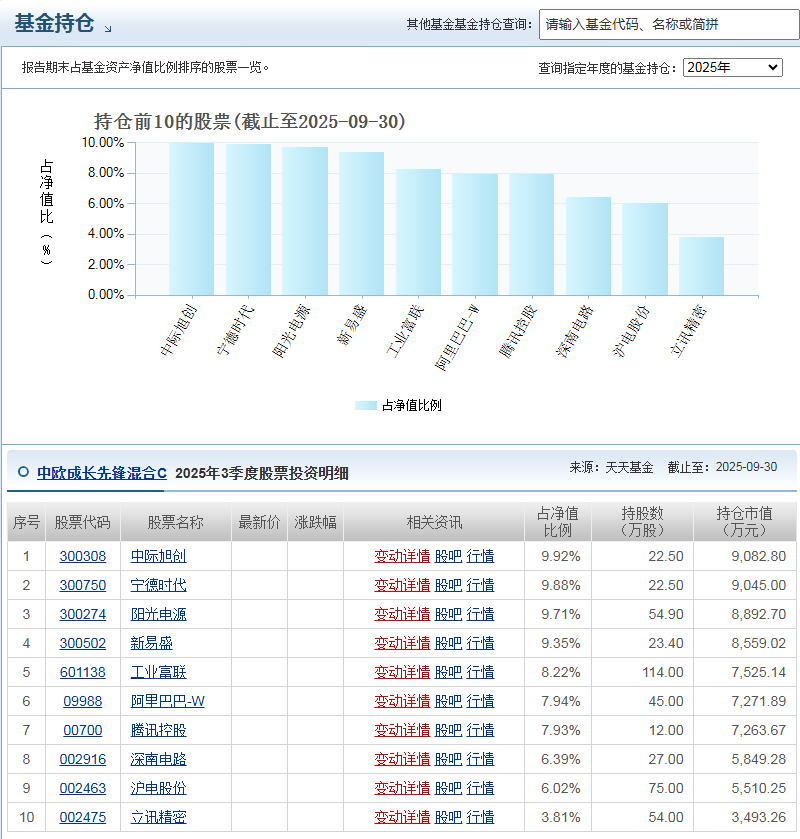 $中欧成长先锋混合C$ 从持仓来看,截至不同时期,其前十大重仓股包含了宁德时代、中际旭创、新易盛等。这些公司大多处于科技、新能源等热门行业,具有较好的成长潜力。以宁德时代为例,它是全球领先的动力电池系统提供商,在新能源汽车行业快速发展的背景下,市场需求大增,公司业绩也有望持续增长,这为基金带来了较好的收益机会。