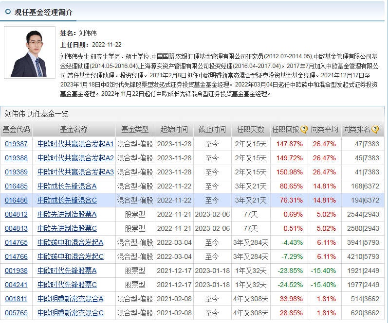 基金经理刘伟伟有着丰富的投资经验,他曾在农银汇理基金管理有限公司担任研究员,后在中欧基金担任多个职位。自2022年11月22日起任中欧成长先锋混合型证券投资基金基金经理,任职期内收益表现良好,他的投资决策和管理能力为基金的运作提供了有力支持。