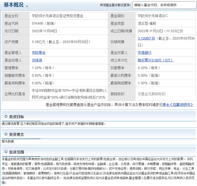 中欧成长先锋混合C成立于2022年11月22日,业绩比较基准为中证800指数收益率60% + 中证港股通综合指数(人民币)收益率20% + 银行活期存款利率(税后)20%,基金经理是刘伟伟4。他有丰富的投资经验,曾在多家基金公司任职,管理过不少基金产品。