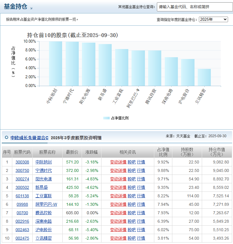 该基金的持仓精准踩中当下科技、新能源等高景气赛道。从行业来看,重点布局制造业,占基金总资产比例达 67.76%,涵盖新能源、电子等细分领域,前十大重仓股中既有宁德时代、阳光电源这类新能源龙头,也有中际旭创、新易盛等通信领域算力相关优质标的。同时,基金还通过港股通投资阿里巴巴 - W、腾讯控股等港股标的,持仓兼顾 A 股与港股的优质资产,既能把握国内产业升级机遇,又能捕捉港股相关标的的投资价值,丰富了收益来源。