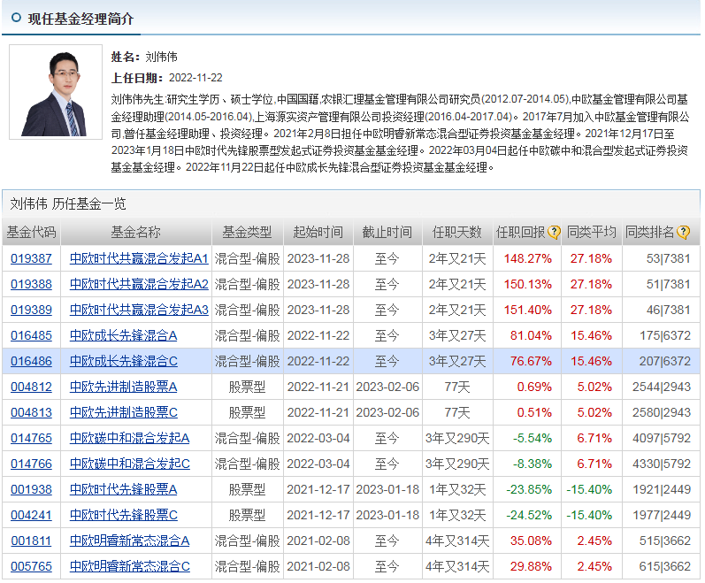 基金经理刘伟伟 2012 年进入证券行业,2022 年 11 月起管理该基金,截至 2025 年 11 月左右,其在该基金的任职回报达 76.63%,年化回报 9.77%。他擅长把握产业趋势,聚焦景气行业的优质龙头公司,在其管理下,基金成功抓住了人工智能、新能源等赛道的发展机遇,通过精准布局相关优质个股,为基金业绩提供了有力支撑,比如持仓的宁德时代、中际旭创等个股,长期来看为基金贡献了不少收益。
