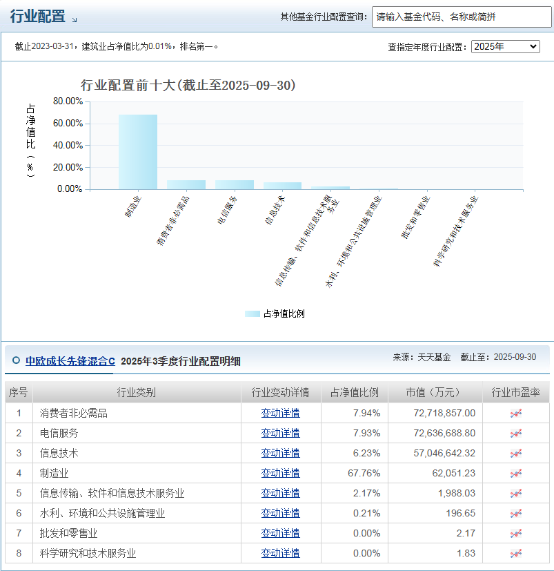 基金持仓以制造业为主,占比高达67.76%,同时涉及信息传输、软件和信息技术服务业等多个领域,行业分布较为均衡。