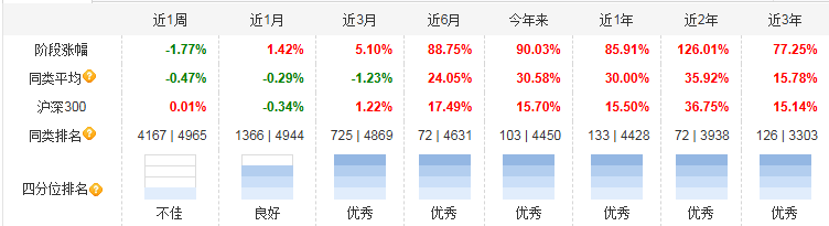 自成立以来,基金净值增长率显著,近3月涨幅达到5.1%;近6月涨幅达到88.75%;近1年涨幅达到85.91%;近2年涨幅达到126.01%;近3年涨幅达到77.25%;今年来涨幅达到90.03%。从2022年11月22日成立以来,涨幅达到76.67%,远超同类平均水平。