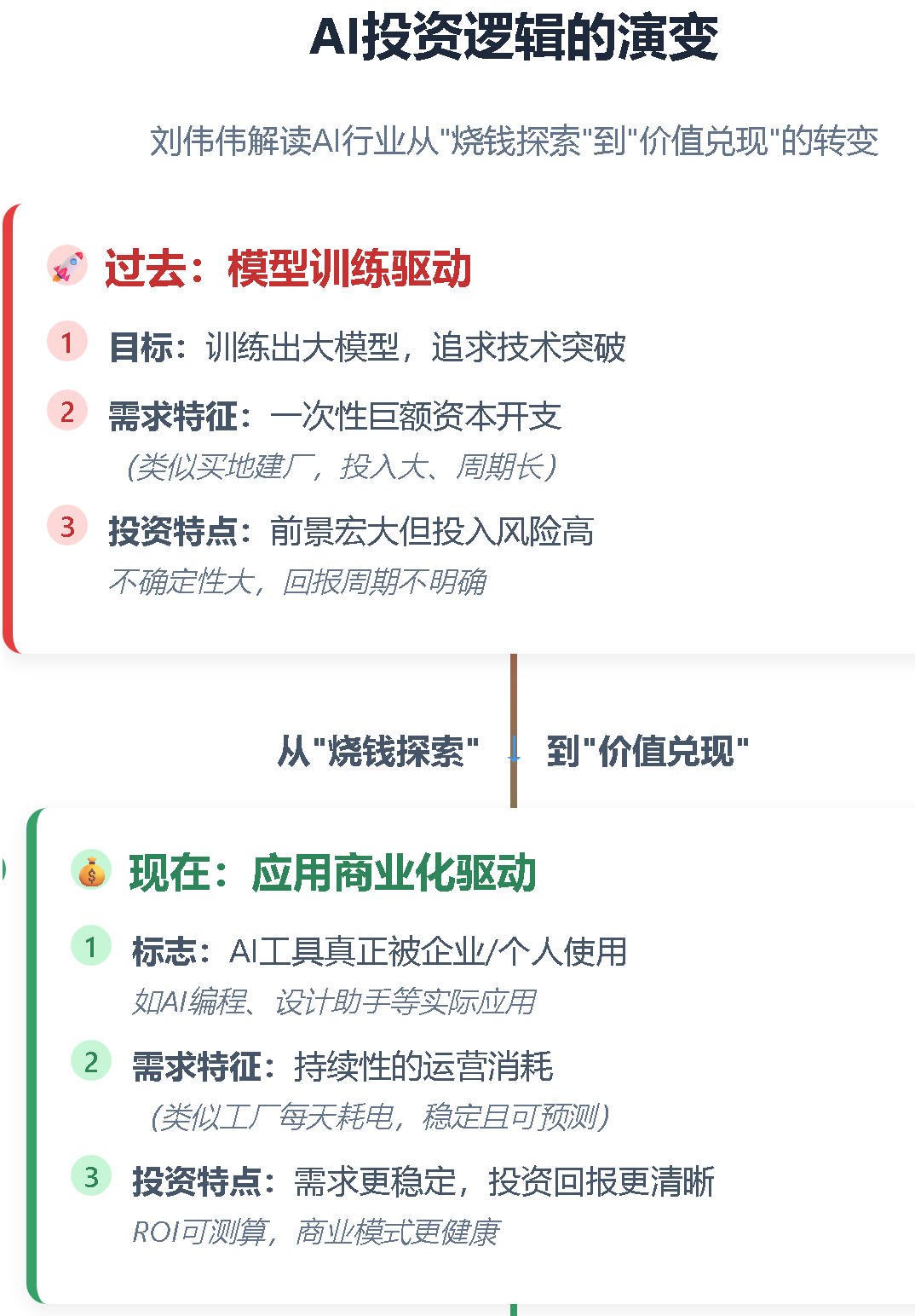 比如AI,他说现在根本不是几年前那种"烧钱训练模型"的玩法了,而是真的有很多公司开始用AI干活、提升效率——你想想,如果AI编程工具能帮一个程序员省一半时间,公司是不是就愿意一直为这个"省时间"的能力付钱?这就好比以前大家买发电机是搞建设(一次性投入),现在发电机能持续供电收电费了(持续消耗),生意模式完全不一样