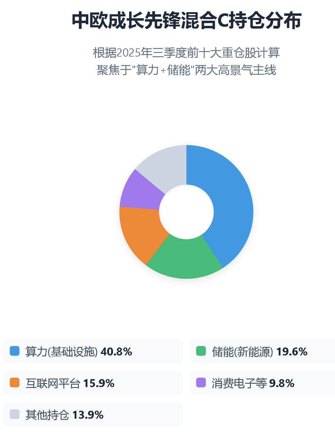 聊到他的中欧成长先锋,我发现前十大重仓股占了六成以上,非常集中。他说在眼下这种经济环境下,景气行业本来就不多,与其每个行业都撒点钱,不如把钱集中在真正能长大的地方。说白了,就是"把钱放在你最有信心的篮子里,然后看好这个篮子"。他的持仓也确实反映这个思路——基本就是围着"算力+储能"转。
