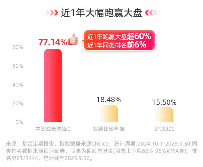 在管产品 $中欧成长先锋混合C(OTCFUND|016486)$,近1年涨幅高达77.14%,大幅跑赢业绩比较基准。