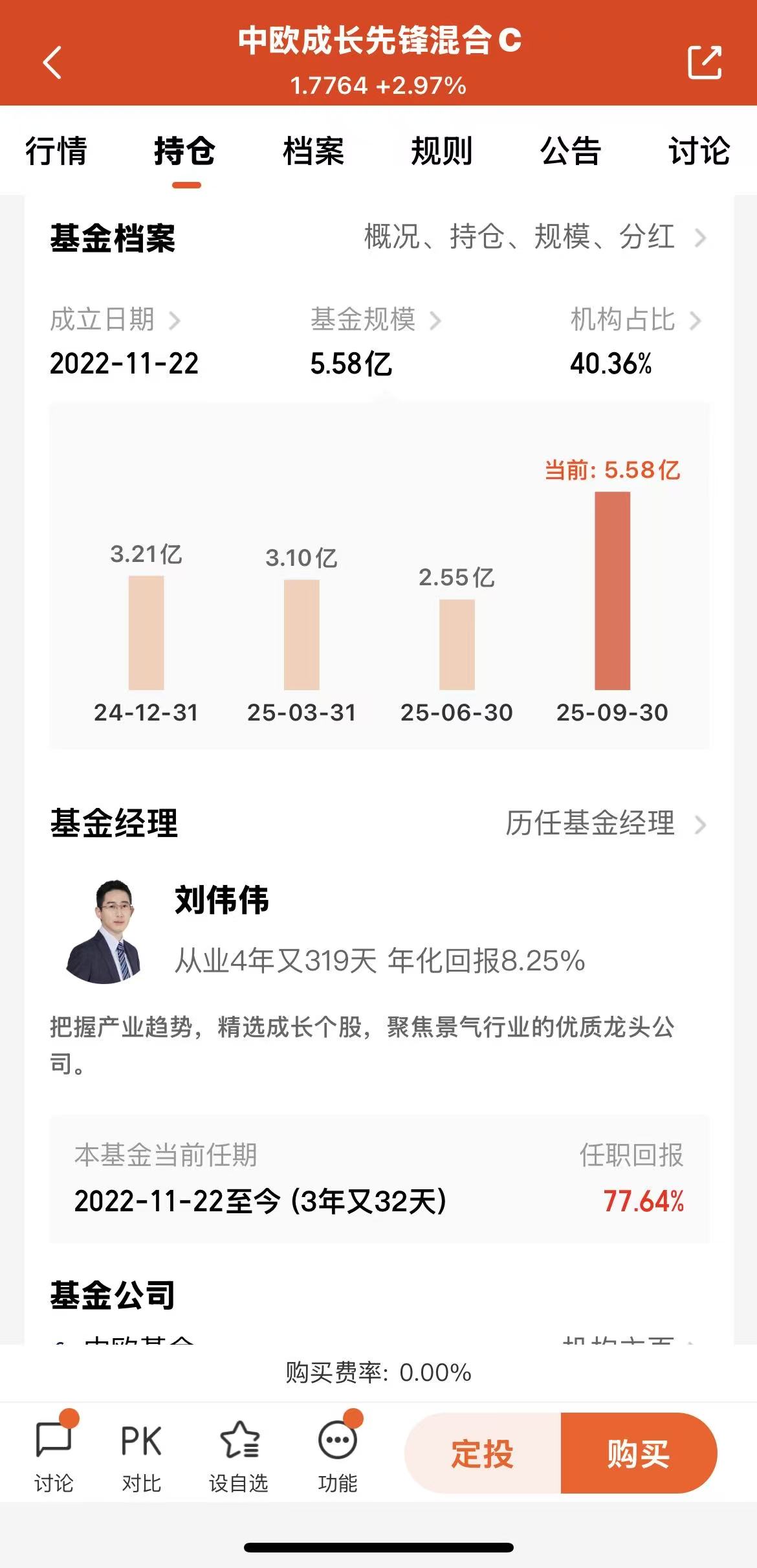 基金规模为5.58亿,船小好调头,其中机构占比40.36%,