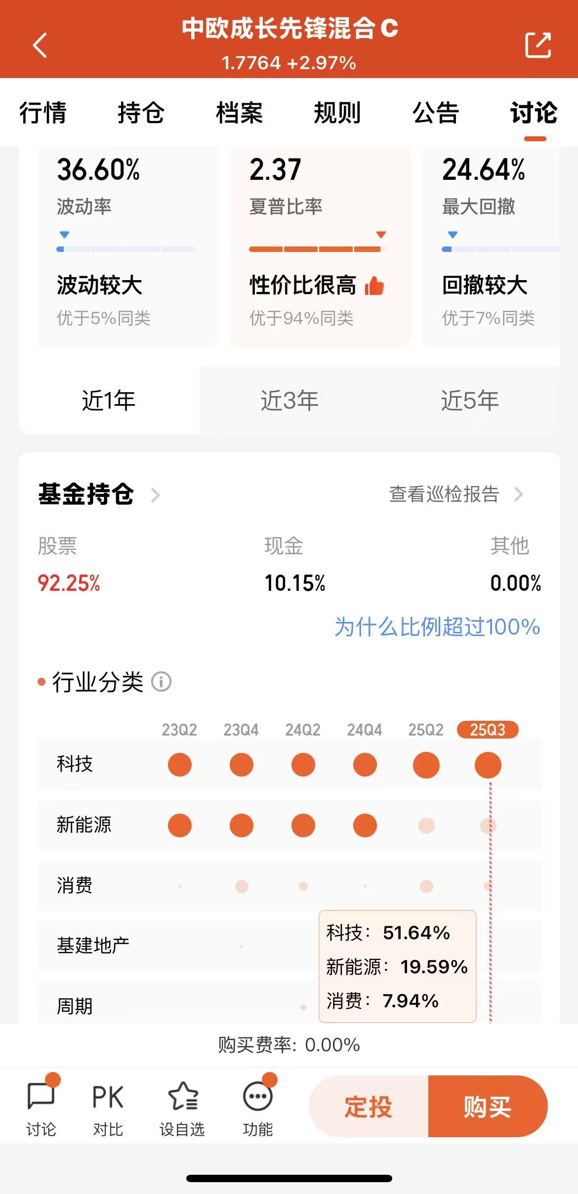 截至3季度,基金持仓中,股票比例为92.25%,现金10.15%,行业布局在科技51.64%,新能源19.59%,消费.94%上面;