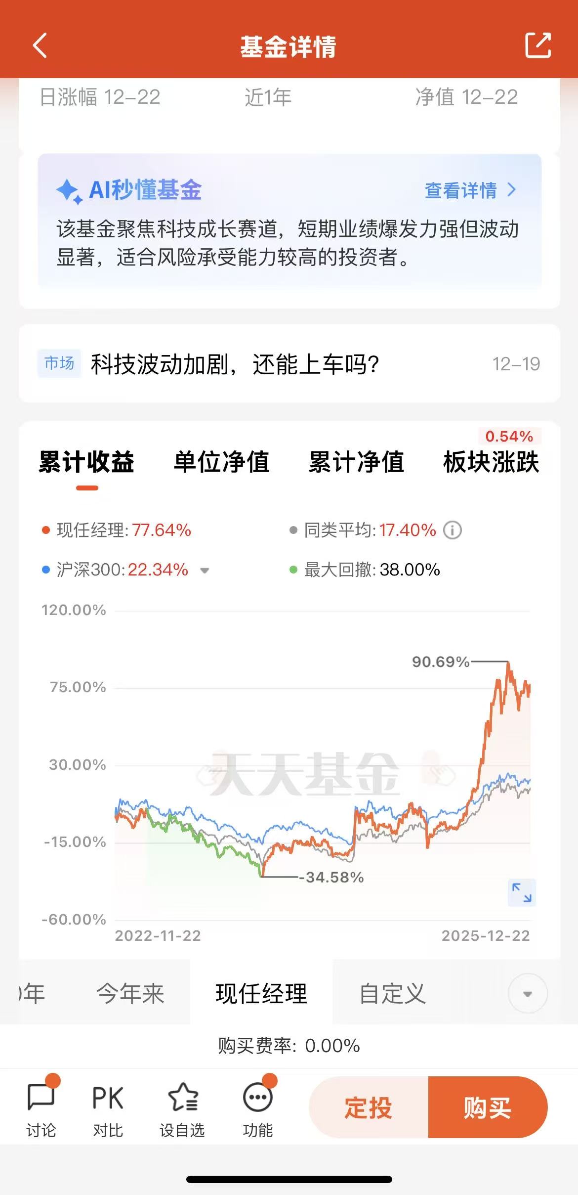 本基金C类成立于2022年12月,近一年收益率达88.42%,基金经理刘伟伟任职以来收益率77.64%,同类平均17.4%,同期沪深300为22.34%,最大回撤38%;