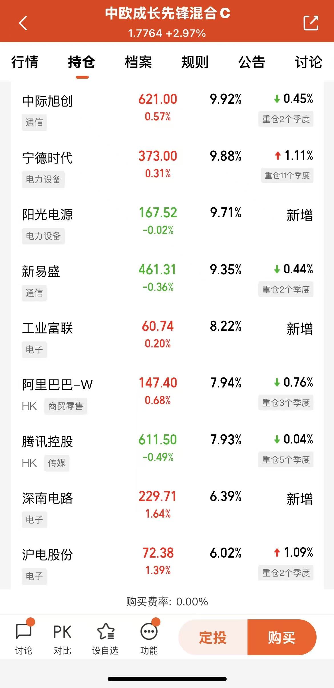截至3季度,持仓个股包括中际旭创、宁德时代、阳光电源、新易盛、工业富联、阿里巴巴和腾讯控股等,