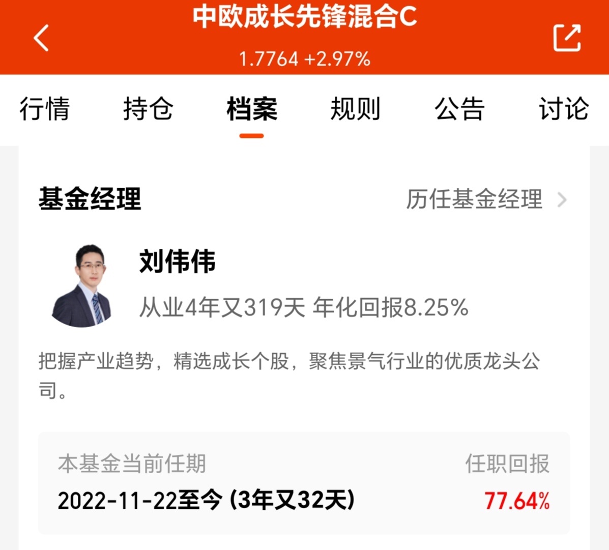 中欧成长先锋混合基金经理刘伟伟,13年证券从业经验,8年投资经验,擅长挖掘科技成长领域投资机会,长期深度研究新能源汽车行业,同时熟悉电子、通信等行业,擅长从产业趋势出发,寻找高景气成长机遇。2022 年 11 月至今管理中欧成长先锋基金,任职回报率77.64%,近1年涨幅高达77.14%,大幅跑赢业绩比较基准。取得如此优秀的超额收益主要得益于管理团体及基金经理刘伟伟高效的执行和运营能力,知行合一对高景气产业和政策周期的深刻理解,对产业趋势的紧密跟踪每个时期总能深度挖掘高端制造和科技领域的优质公司。