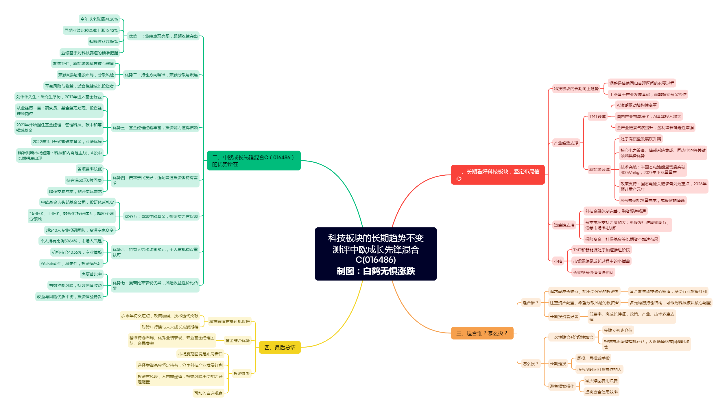 接下来白鹤君就跟各位聊聊自己对于科技板块特别是TMT和新能源两大领域的看法,并深度测评下中欧成长先锋混合C(016486),文章有点长,这里也是做了个思维导图,方便大家整理思路,可以点开放大了看下的。