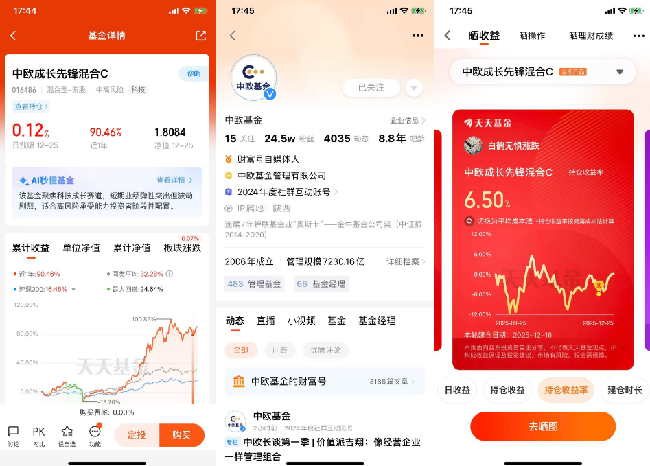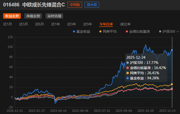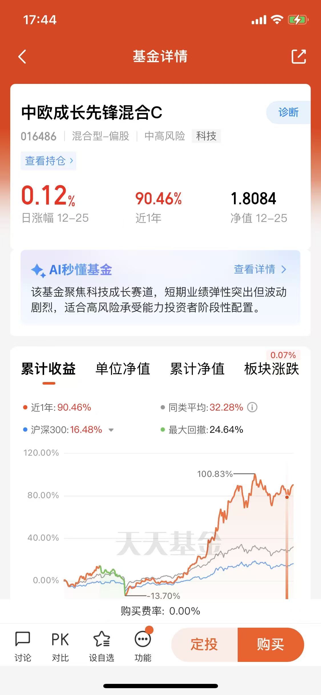 在明确了科技板块的长期投资价值后,选择一只靠谱的基金就成了关键。我之所以在前些天回调时果断入手中欧成长先锋混合C(016486),主要源于以下几个方面的考量: