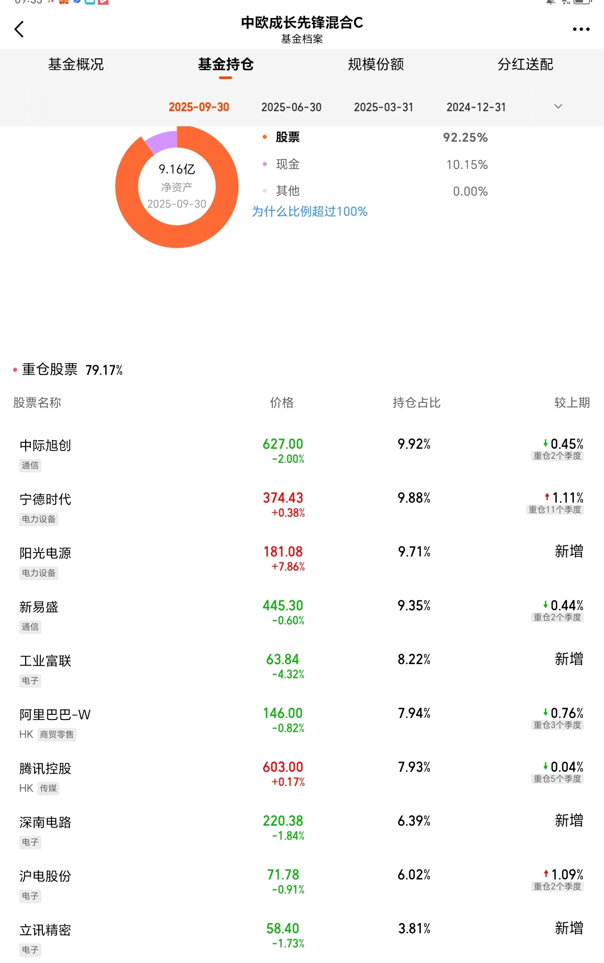 从重仓股来看,基本重仓的是科技赛道,比如中际旭创就是通信设备方面的大牛股,宁德时代更不用说,电池大佬,阳光电源光伏设备,工业富联电子消费。