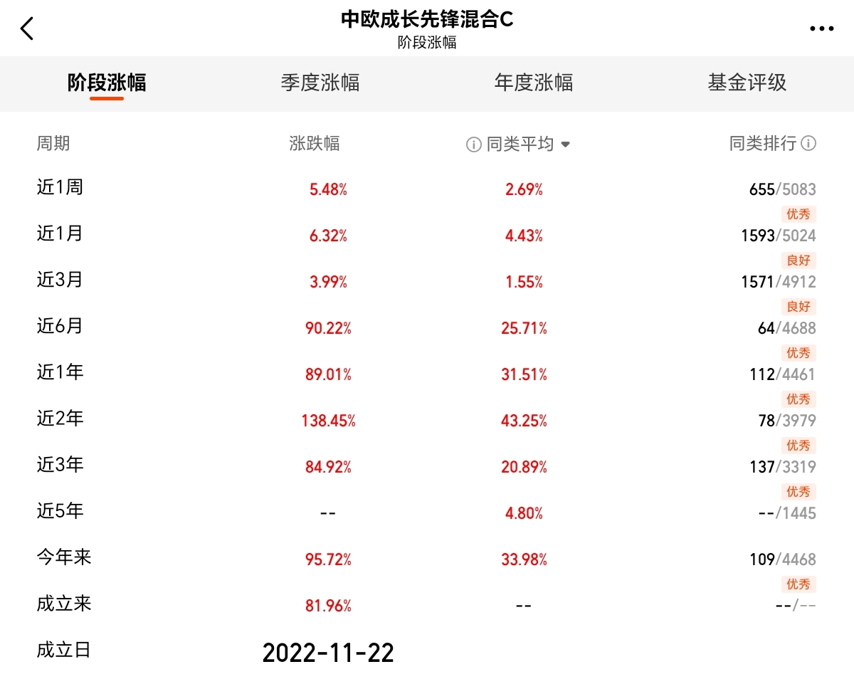 这只基金的业绩确实不错啊,最近一年大涨89%,最近6个月更是厉害,直接就是90.22%,最近3个月也涨了3.99%,最近一个月上涨高达6.32%。