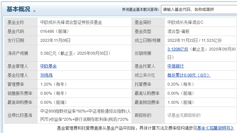 核心三:中欧成长先锋混合C(016486)产品介绍及深度评测。