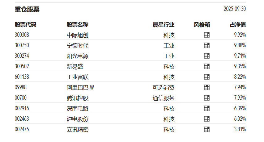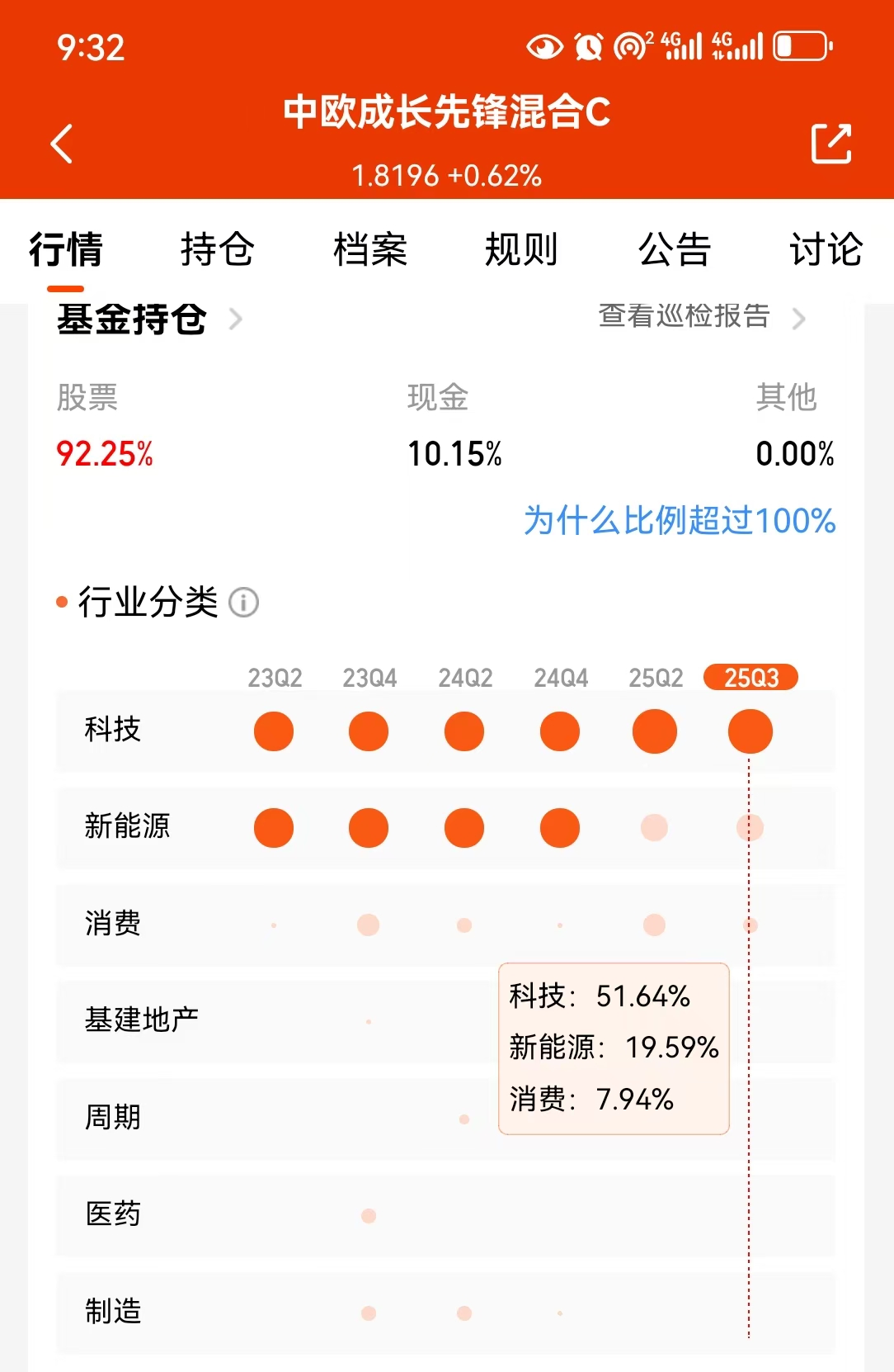 天天基金对于基金行业分类中更是直观列出其三季度持仓中科技占比51.64%,新能源占比19.59%。
