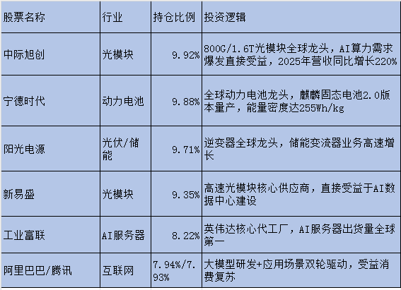 精选优质龙头:前十大重仓股集中度79.16%,包括中际旭创(9.92%)、宁德时代(9.88%)、阳光电源(9.71%)等各细分领域绝对龙头,业绩确定性强