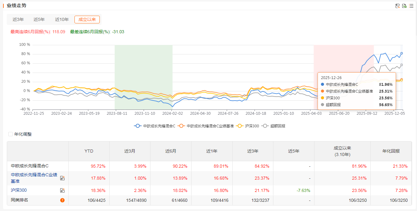 中欧成长先锋混合基金成立于2022年11月22日,代码为016485(A类)和016486(C类),由中欧基金管理有限公司管理,中信银行股份有限公司托管。该基金采用偏股混合型运作方式,股票投资比例为基金资产的60%-95%,其中投资于港股通标的股票不超过全部股票资产的50% 。截至2025年12月,A类基金规模约为9.48亿元,C类基金规模约为5.6亿元。