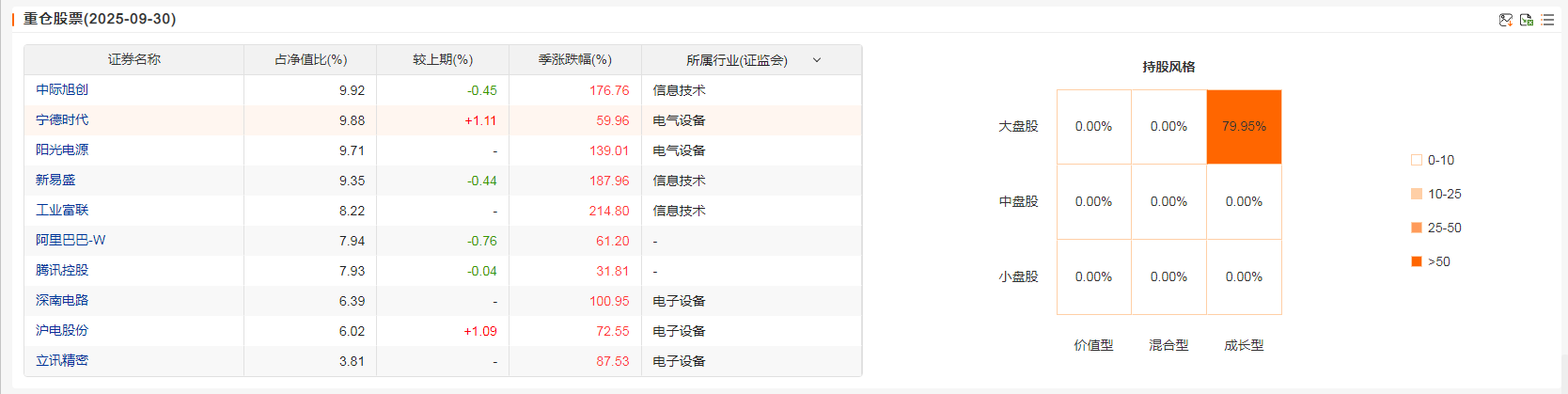中际旭创是高速光通信模块领域的龙头企业,2024年营收238.62亿元,同比增长122.64%,净利润51.71亿元,同比增长137.93%。公司产品包括800G、400G等高速光模块,广泛应用于数据中心和AI算力基础设施。基金经理在2025年三季度报告中表示,海外算力需求比预期更强,因此增加了算力板块的配置比例,这与中际旭创的业绩增长相吻合。