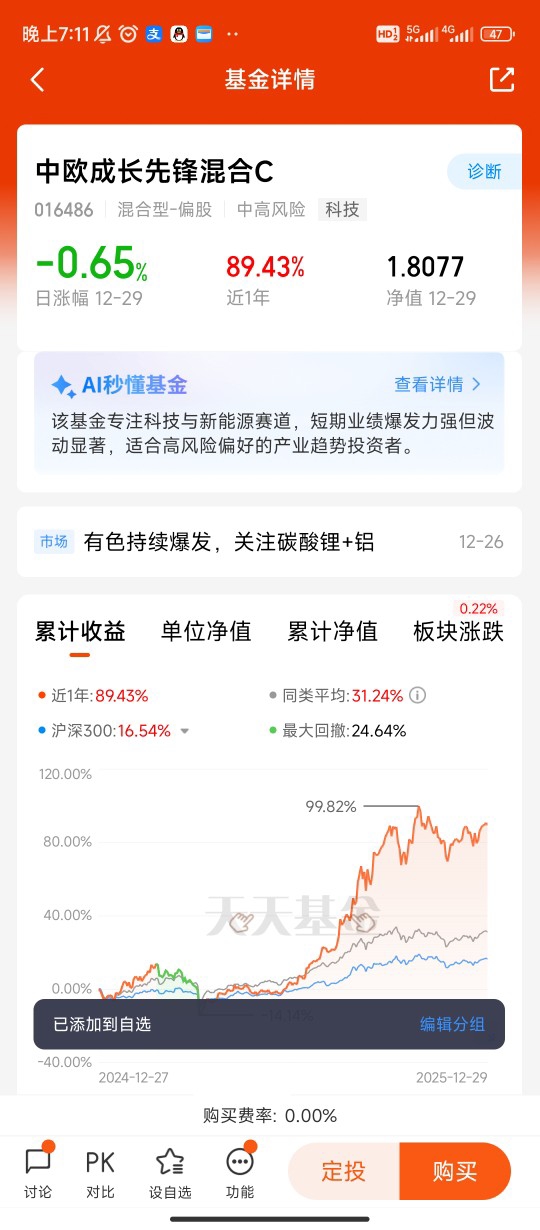 作为一名长期关注科技成长板块的投资者,我很荣幸能够参与这次关于中欧成长先锋混合C的调研活动。作为中欧基金刘伟伟经理管理的产品,该基金在科技成长领域展现出了出色的投资能力,近一年收益率达88.92%,今年以来收益率更是高达93.72%,大幅跑赢同类基金平均水平。今天我想从三个维度分享我对科技成长板块的看法、投资心得,以及对刘伟伟经理投资理念的理解。