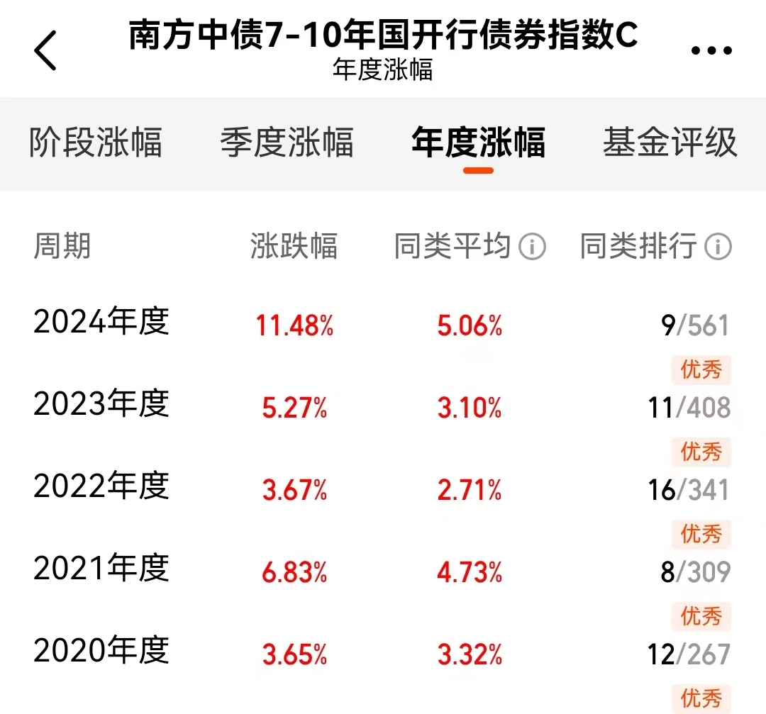 这个$南方中债7-10年国开行债券指数C$(006962)就是我比较留意的一只。它主要随着国开行债券指数,持仓透明,以高等级利好性金融债为主。从绩效看,成立以来每个完整年度均实现正收益,即便在部分年份市场大幅起伏时,它也保持了稳步上行。这类资产与权益类表现相关性较低,在组合中加入一定比例,有助于平滑整体收益曲线。对于注重长期累积的投资者,值得多看一眼。#高盛看多A股:慢牛正形成 还有约30%上涨空间#