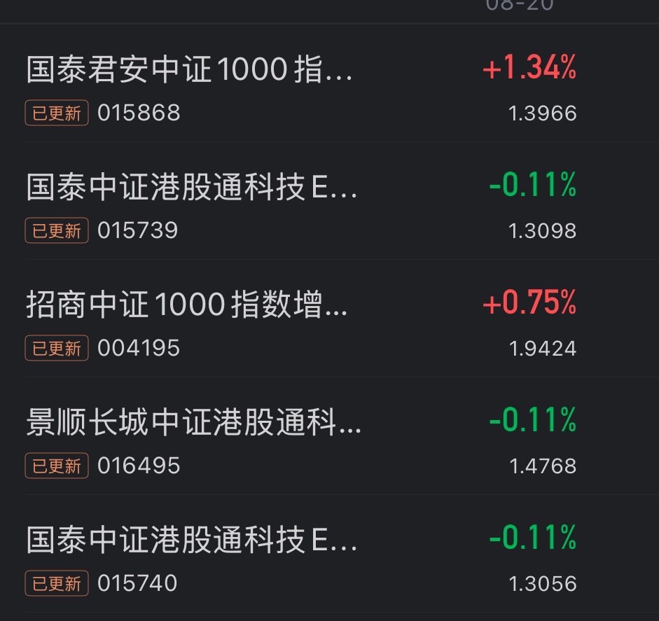 国泰基金管理经验丰富,长期业绩稳健,投资者可以放心长期持有,收益可靠可预期。$国泰君安中证1000指数增强C$ 上涨1.34%$招商中证1000指数增强C$ 上涨0.75%$景顺长城中证港股通科技ETF发起联接A$ 上涨0.11%