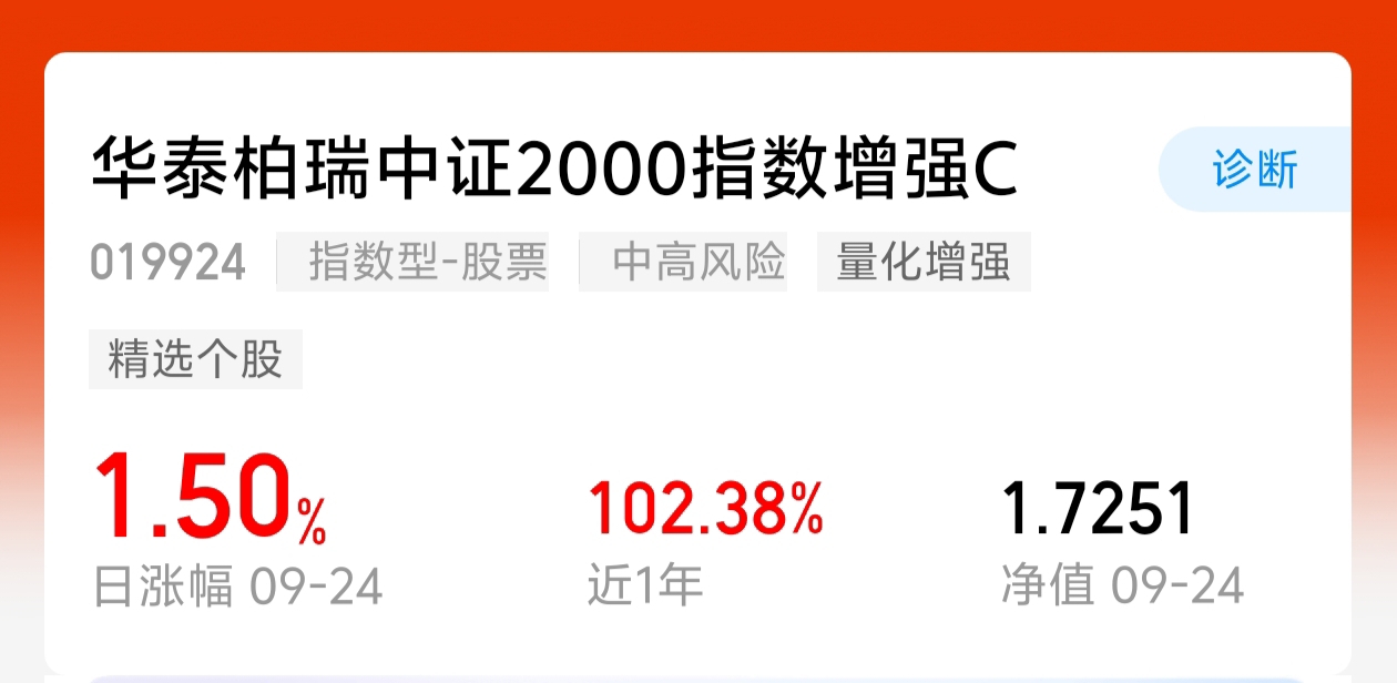 华泰中证2000这后劲真足,近三个月又涨了24.05%,关键是$华泰柏瑞中证2000指数增强C$ 近一年实现了收益102.38%,对比基准指数超额收益非常明显。