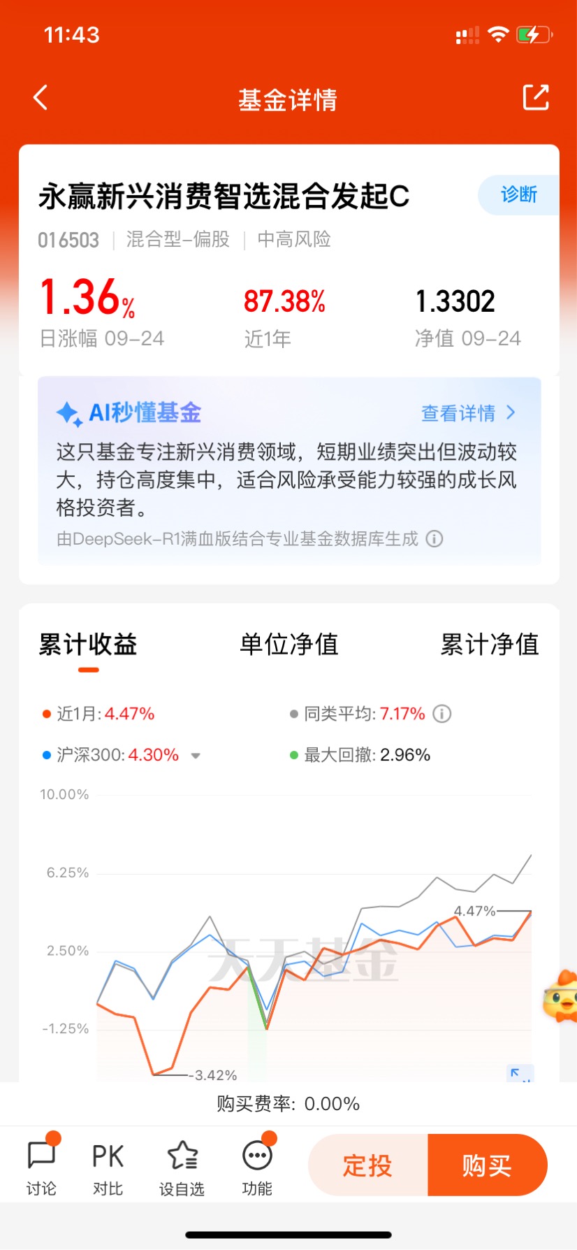 不知道双节来临,能不能来带动一波消费啊!$永赢新兴消费智选混合发起C$ 是一只专注新兴消费领域的基金,持仓高度集中,昨天涨了1.36%,近三个月26.67%涨幅,近半年56.00%涨幅,近一年87.38%涨幅,业绩表现还是很优秀的,这里采用中盘价值风格与高集中度策略,继续关注了!#高盛称A股“慢牛”格局稳固#