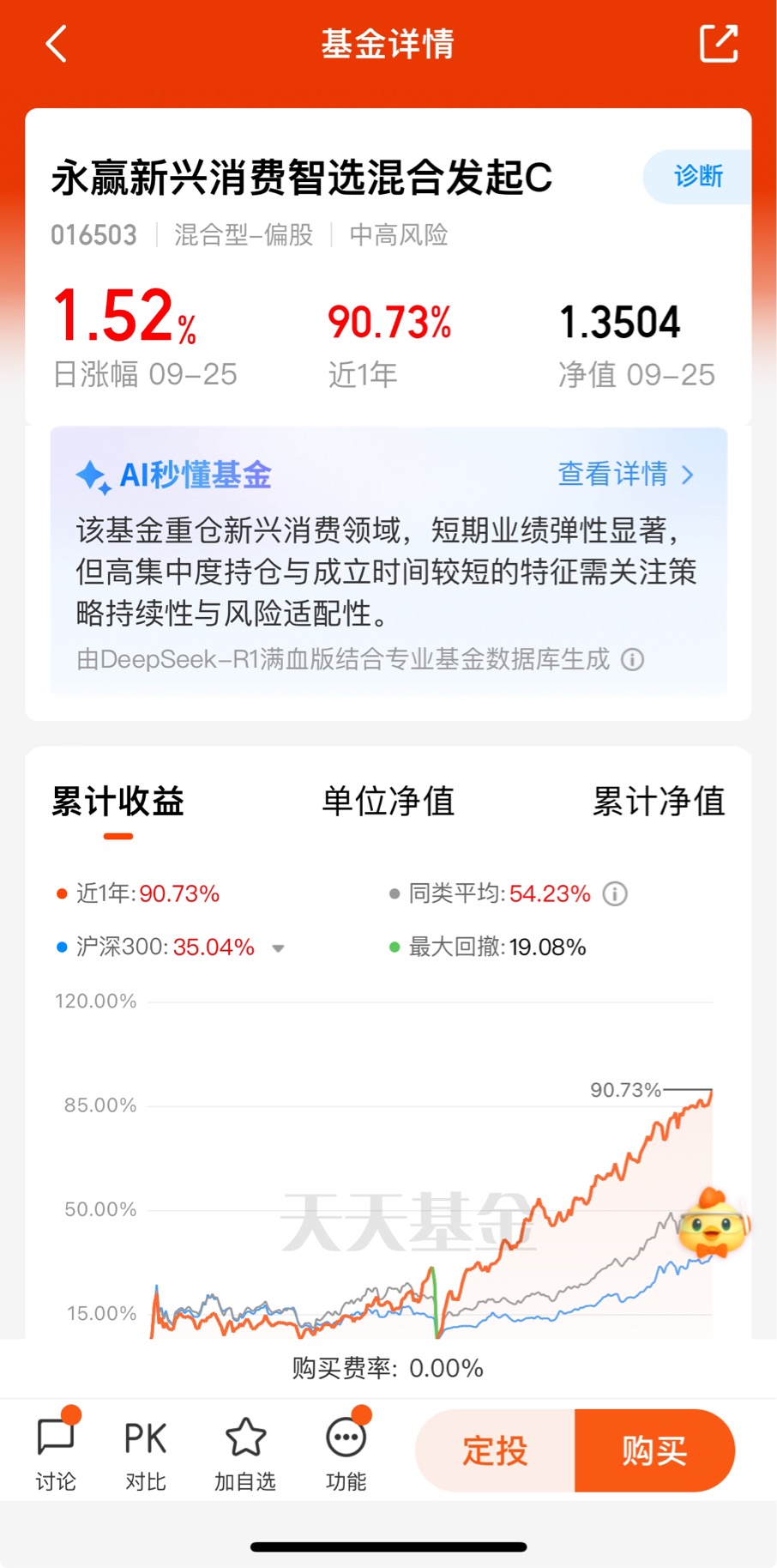 $永赢新兴消费智选混合发起C$昨天收1.52%,近一个月收6.52%,近3个月收