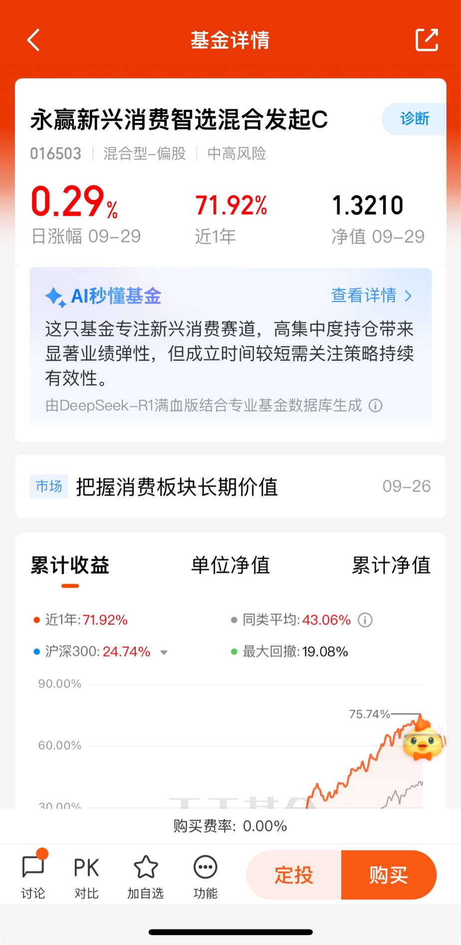 $永赢新兴消费智选混合发起C$昨天收0.29%,近一个月收4.18%,近3个月收