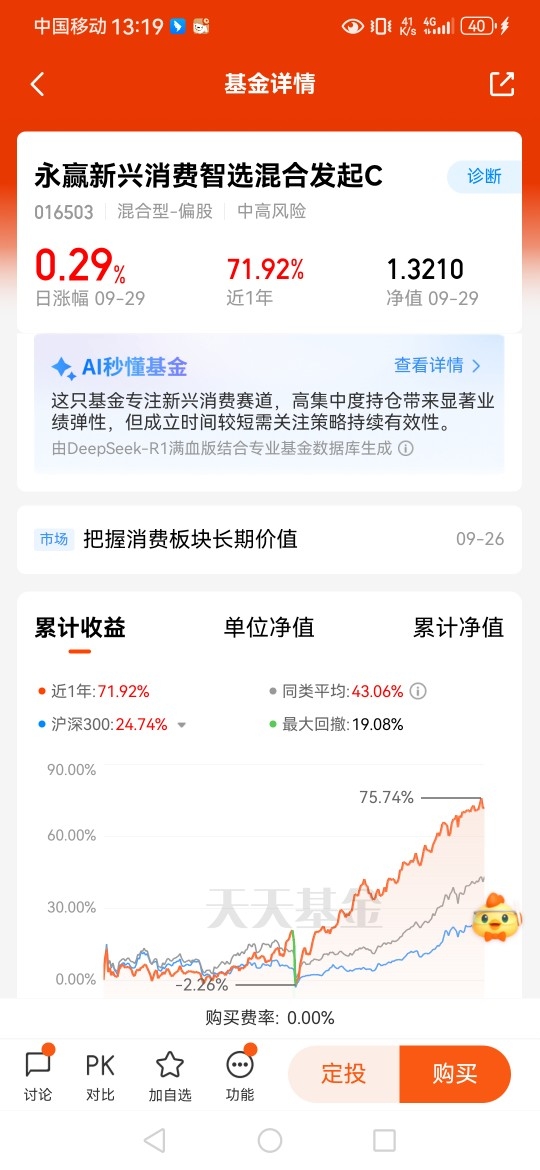 永赢新兴消费智选主要投资策略是通过投资于新兴消费主题相关的资产,昨日上涨+0.29%,近一年涨幅+71.92%,在力争控制组合风险的前提下,实现资产净值的中长期稳健增值,这里持股集中度较高,行业分布多样化,而且目前规模较小,值得继续关注了!#九月基金投资策略#