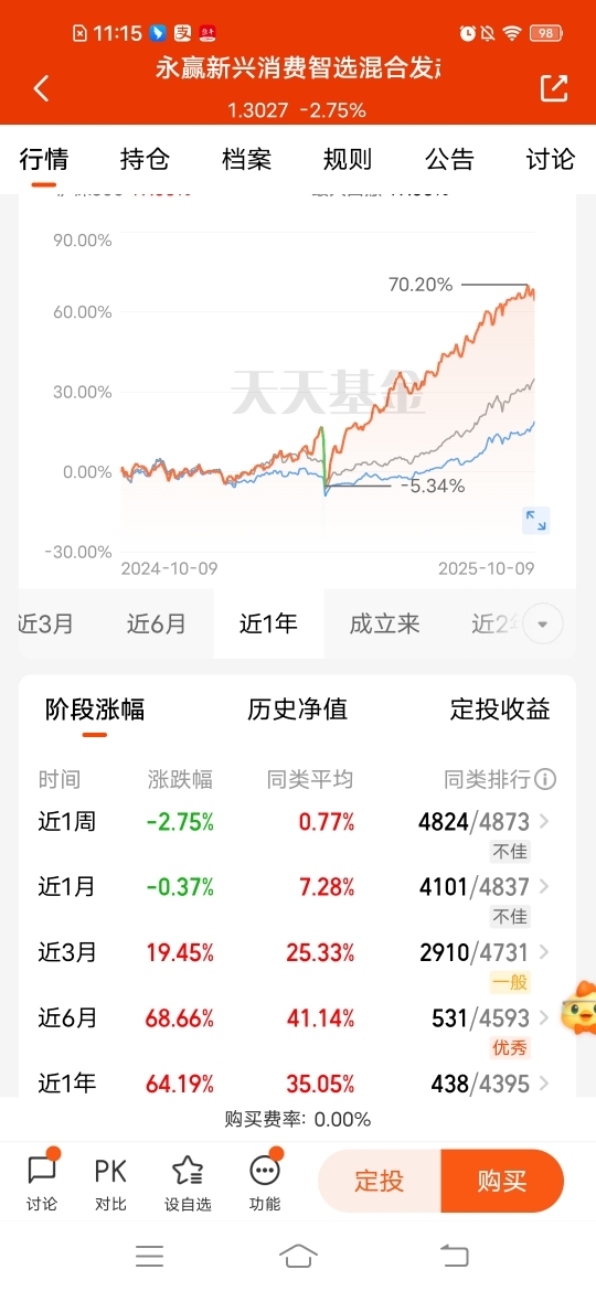 $永赢新兴消费智选混合发起C$趁着调整入手更有动力,大趋势不错,近三个月涨幅19
