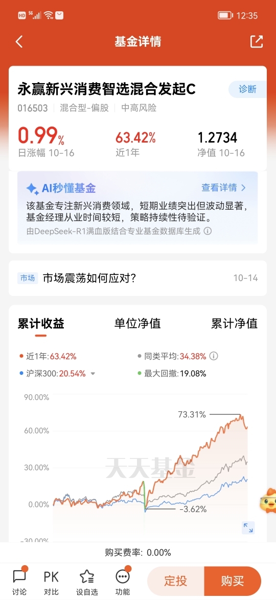 $永赢新兴消费智选混合发起C$ 聚焦消费成长,重点关注创新药、出海、新消费等领域,侧重长期收益,同时适当兼顾短期成长性。昨天上涨0.99%,近六个月涨49.92%,近一年63.42%的涨幅,中长期业绩表现优秀。大盘回暖,板块轮动下消费走强。扩内需政策催化叠加估值修复,板块赚钱效益提升,看好后市,定投分批入也不错。#10月基金投资策略#