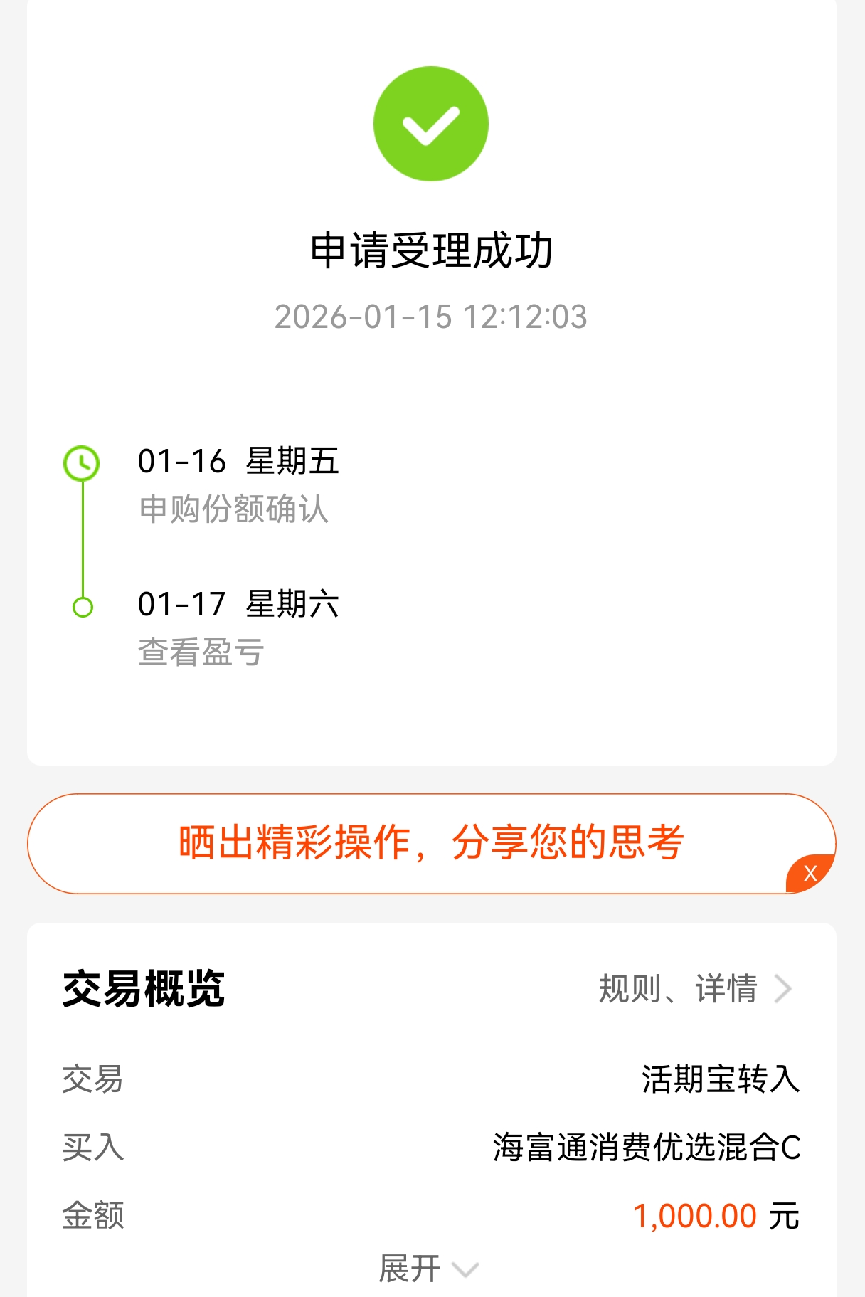 宝子们,今日A股三大指数集体低开,沪指跌0.48%,深成指跌0.63%,创业板指跌0.93%,商业航天、ai应用等板块指数跌幅居前,板块轮动比较快。当前消费板块位置比较低,可以低吸一波等反弹,今日加1000$海富通消费优选混合C(OTCFUND|010422)$,近一个月涨幅5.73%,近六个月涨幅32.72%,近一年涨幅84.11%,同类近一年涨幅42.25%,远超同类涨幅,基金费率低,操作起来也灵活,经理能力强,表现很突出。