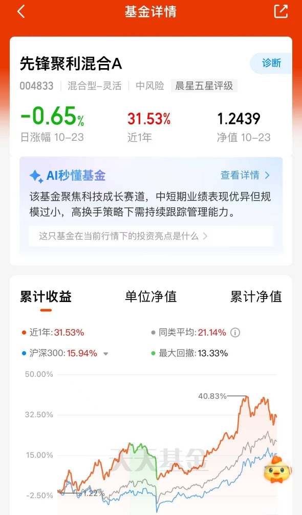 先锋聚利混合A这波六天五涨够强势,今天估值1.35%单日涨幅,近三个月7.97%稳稳收成,利率下行环境中科技成长股配置价值被充分释放