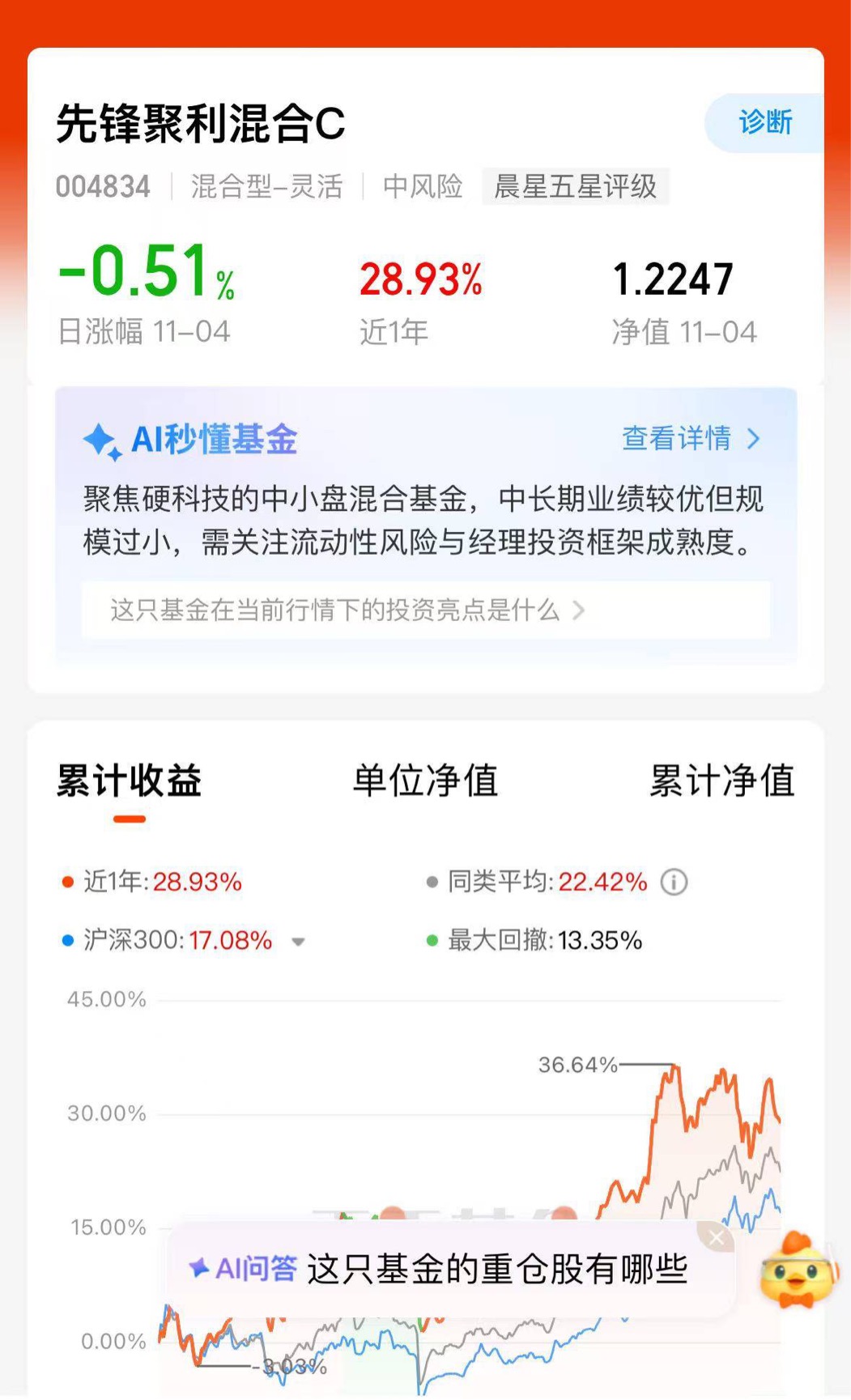 对比大盘就知道先锋聚利混合C多能打,近三个月8.36%收益,近一年28.93%翻倍级增长,今天回调还涨%