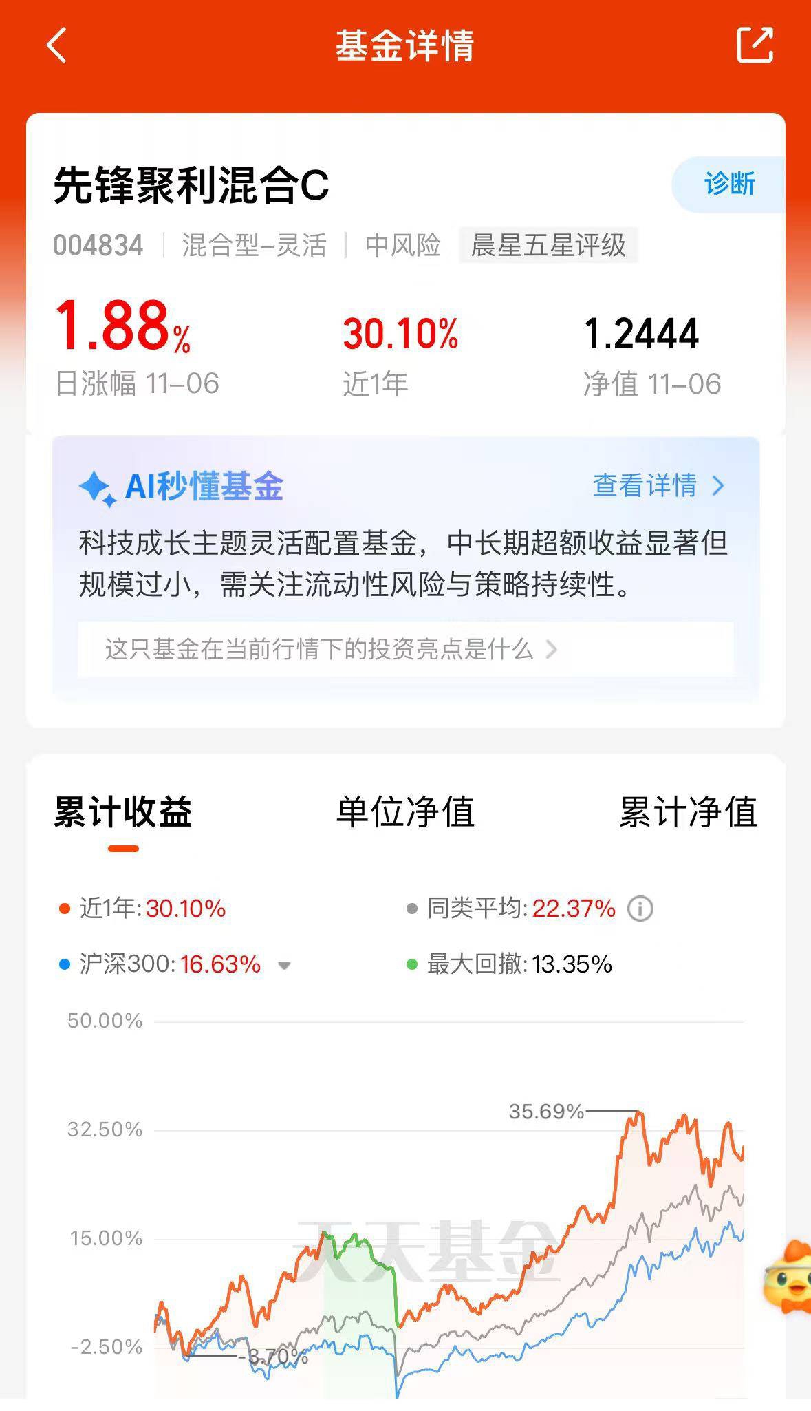 先锋聚利混合C$科技板块业绩香的很收今天回调就收获了%近1年收30.10%,近3