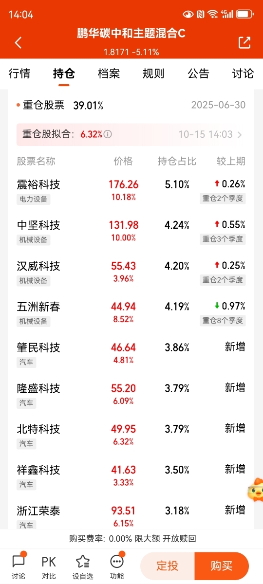 $鹏华碳中和主题混合C$希望没有调仓,今天能吃到肉!亏12%了,赶紧让我回点本吧