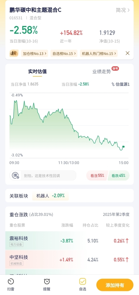 鹏华碳中和主题混合C今天跌了2.58%。碳中和相关板块今天不太给力,市场资金对这块热情好像不高,所以基金就跟着跌了,希望后面能好起来。