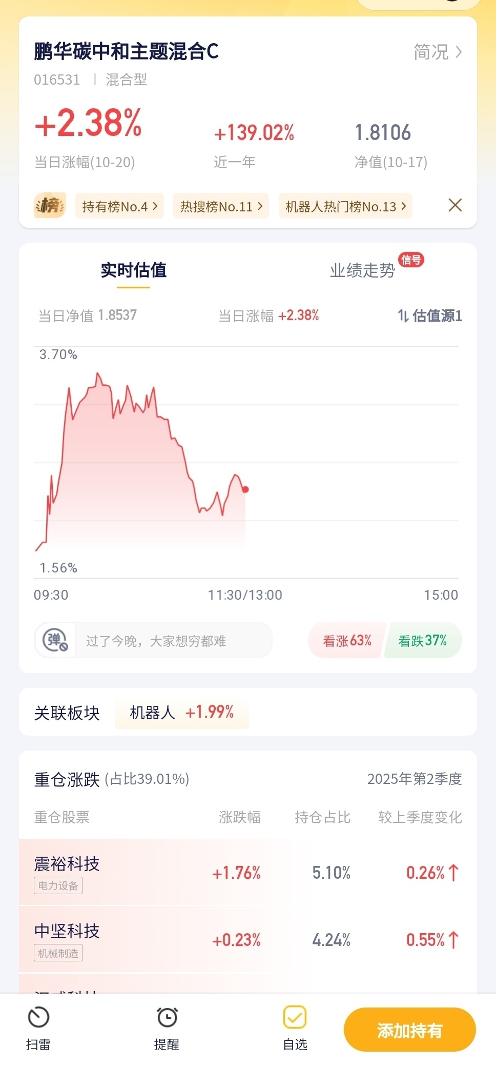 今天碳中和主题板块挺给力,资金往这儿投,这基金就跟着涨啦。碳中和是长期方向,后续估计还能有不错表现~