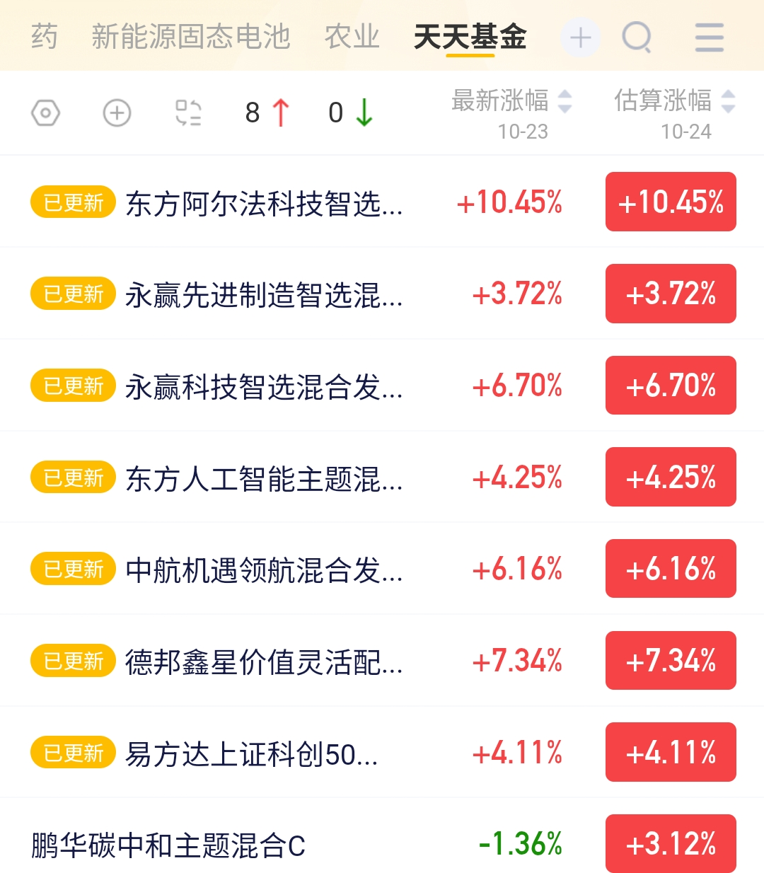 科技股扛旗,A股放量上攻!芯片板块爆拉,存储芯片、CPO概念领涨,机构资金狂涌。AI算力需求撑腰,行业景气度持续。憋屈的震荡后,今天芯片终于大涨,其中最牛的就是东方阿尔法这支,当日涨幅领先,净值第一!硬气!$东方阿尔法科技智选混合发起C$ $鹏华碳中和主题混合C$ $永赢先进制造智选混合发起C$