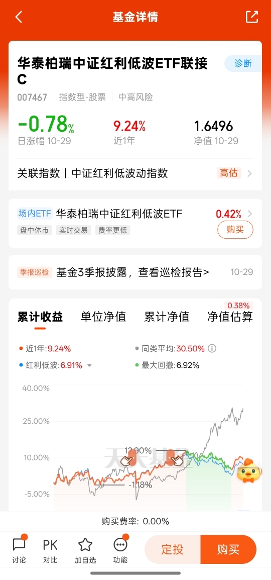 聊起今天的行情,红利低波绝对是显眼的存在。别的板块可能涨一天跌两天让人揪心,它却能保持住节奏,这就是低波动的好处啊。现在理财收益不高,股市又起伏不定,这种能有稳定股息、波动还小的方向,简直是“定心丸”。要是觉得自己选个股麻烦,直接选华泰柏瑞就行,它专门做这个领域,能帮我们把好的标的都收进来,省事儿又放心,符合大多数人求稳的想法。