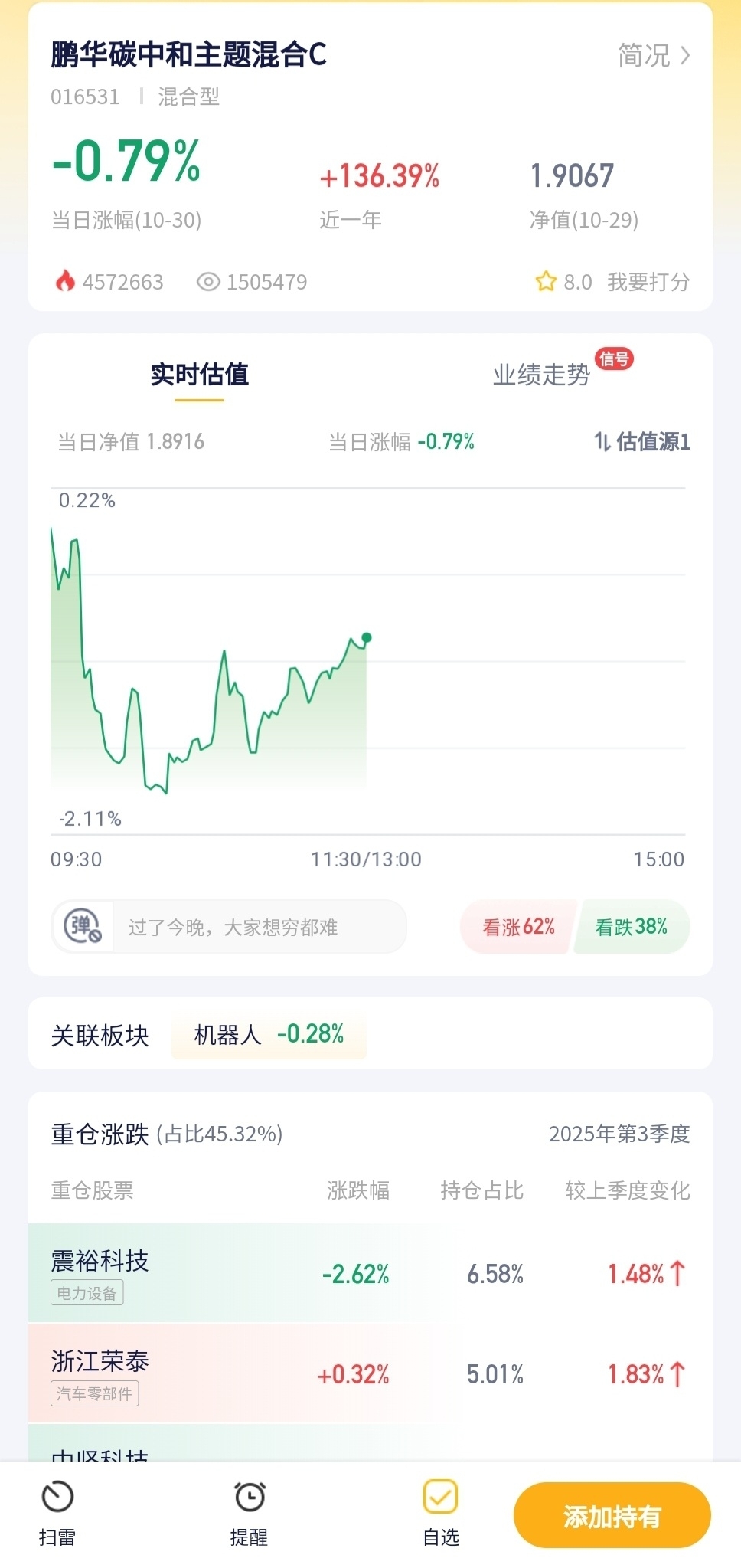 鹏华碳中和主题混合C今日预估跌幅-0.79%!