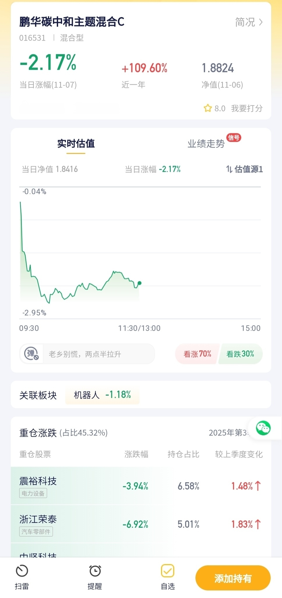 鹏华碳中和主题混合C今日预估跌幅-2.17%!