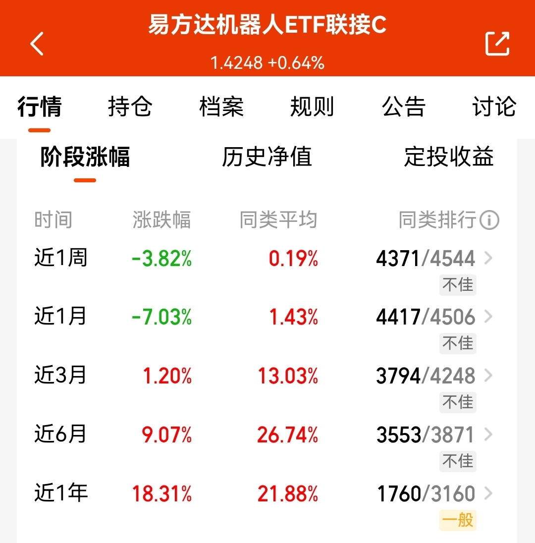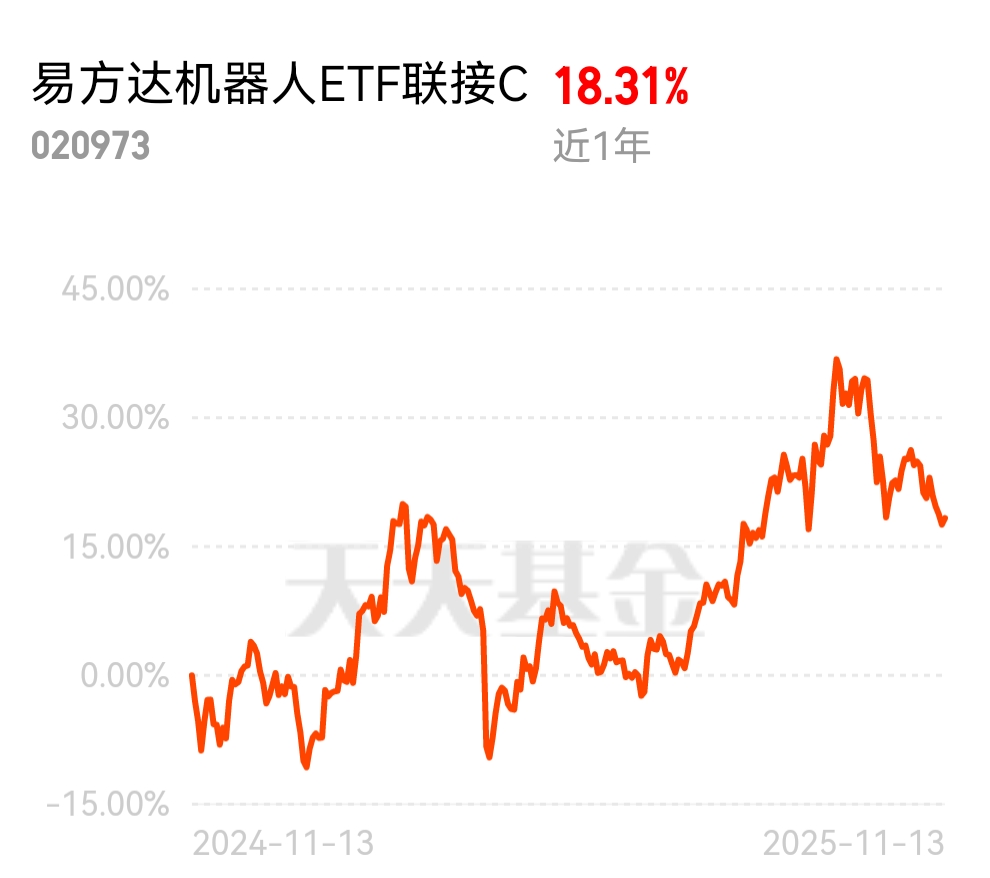 科技板块持续调整,估值担忧情绪还在,不过,前期调整较多的机器人板块,局部翻红,相对也是更为抗跌一些,而且这支$易方达机器人ETF联接C$ 近半年收益9.07%,跟踪机器人指数,明显波动更小一些;